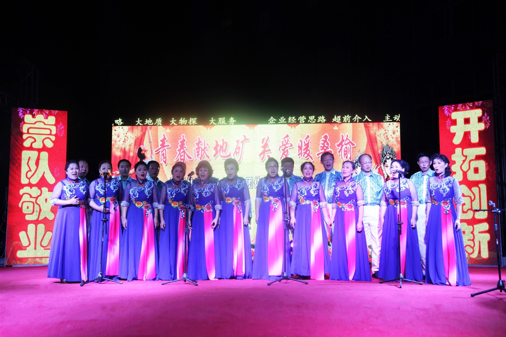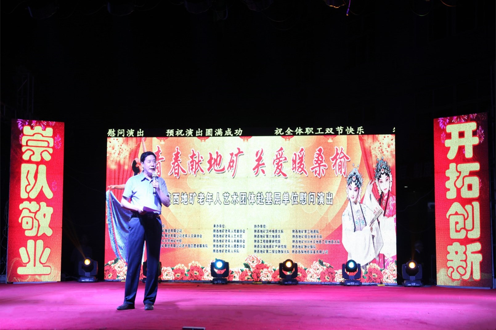 ? ? 在國(guó)慶、中秋節(jié)來(lái)臨之際,9月28日晚,陜西地礦老年人藝術(shù)團(tuán)“青春獻(xiàn)地礦、關(guān)愛(ài)暖桑榆”主題晚會(huì)在我隊(duì)慰問(wèn)演出,節(jié)目精彩紛呈,讓全隊(duì)干部職工讓享受了一場(chǎng)別開(kāi)生面的視聽(tīng)盛宴。集團(tuán)公司黨委副書(shū)記安增會(huì),離退休管理所主任李崇勇、副主任張寧親臨現(xiàn)場(chǎng)觀看演出。